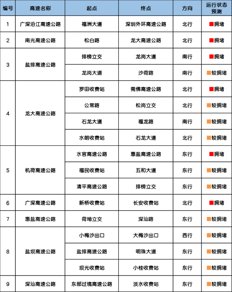 预计离深车流出行高峰全市高速公路拥堵路段分布如下——