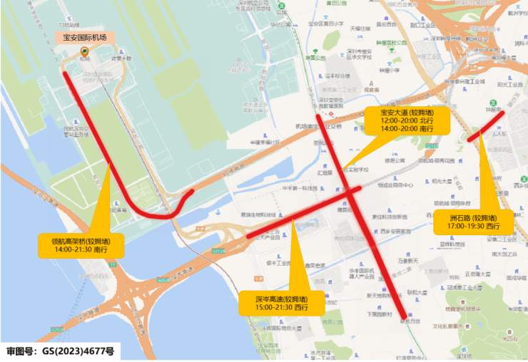 其中,宝安国际机场假期单日旅客吞吐量将超18万人次,航空离深高峰期宝安国际机场周边拥堵路段主要分布在宝安大道、洲石路、领航高架桥等,具体分布如下——