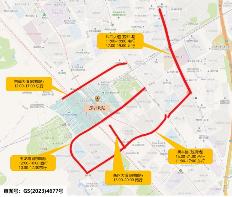 国庆假期深圳铁路日均到发旅客量将超60万人次,单日到发旅客量将超70万人次,铁路离深高峰期深圳北站周边拥堵路段主要分布在玉龙路、民丰路、民治大道等,具体分布如下——