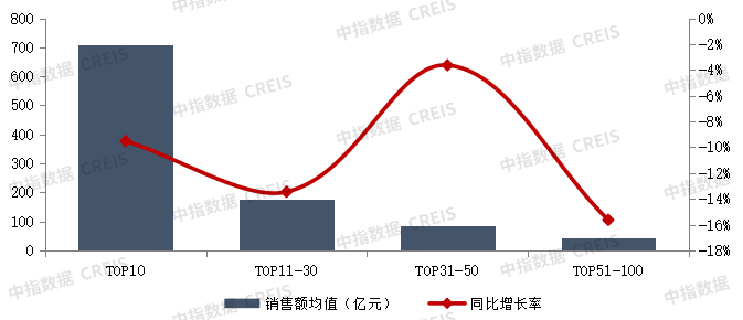 2025年1-5月,各阵营房企销售额均有下降。其中,TOP10房企销售额均值为707.5亿元,较上年下降9.5%;TOP11-30房企销售额均值为175.0亿元,较上年下降13.5%;TOP31-50房企销售均值为86.8亿元,较上年下降3.6%;TOP51-100房企销售额均值为42.5亿元,同比下降15.6%。