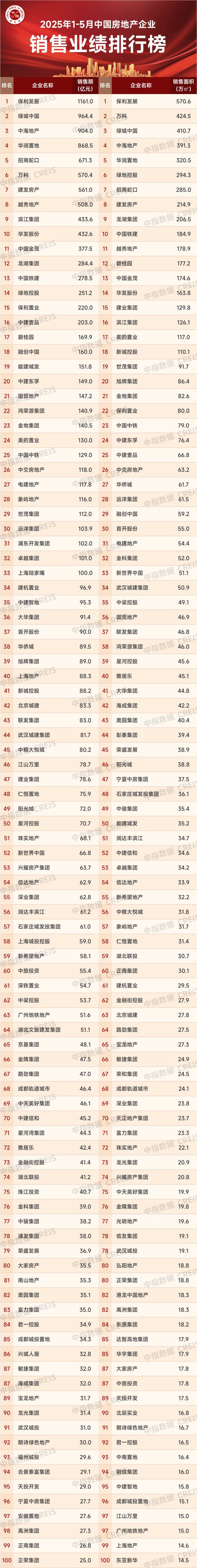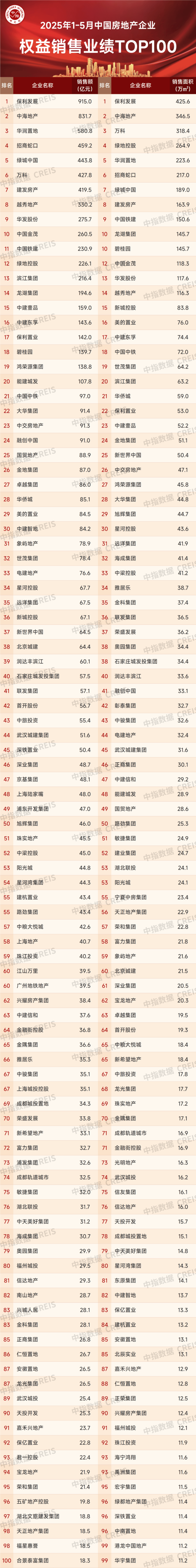 2025年1-5月中国房地产企业销售业绩排行榜出炉