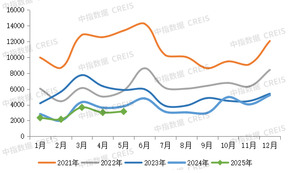 图:2021年1月-2025年5月TOP100房企单月销售额情况(单位:亿元)