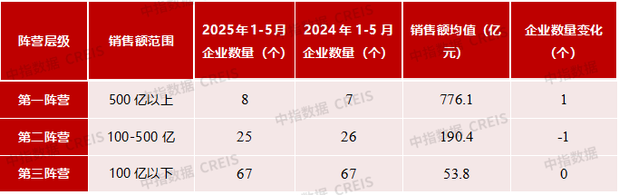 表:2025年1-5月TOP100房企各阵营数量及销售额均值情况