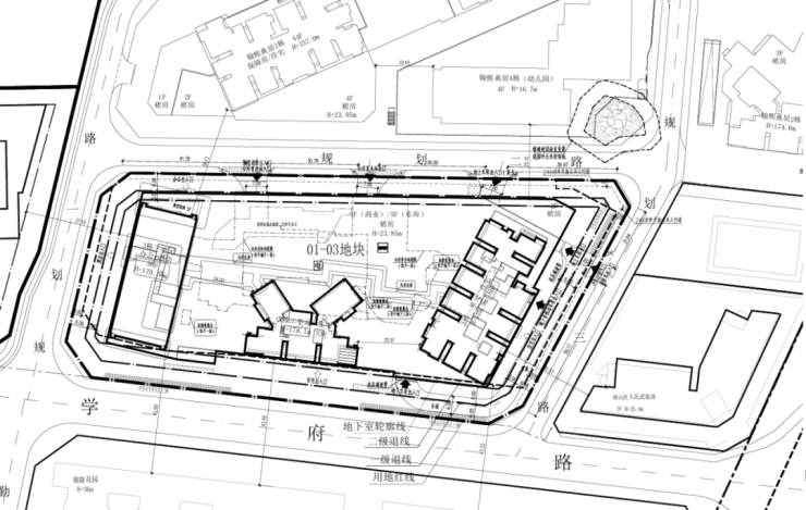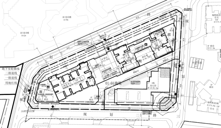01地块:规划3栋44层、55层、55层超高层住宅(1栋一、二、三单元),以及1栋幼儿园(4栋)。