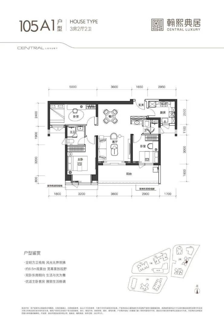 105㎡A1户型:位于三单元03梯腿,3房2卫、典型的双龙抱珠格局、入户带玄关,朝东向,阳台开间6.5米,客餐厅面积约23㎡,主卧套房约16㎡,主客卧分开私密性好。