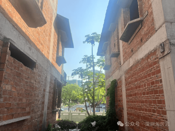 从靠近新湖路一侧的别墅的过道间, 能看到不远处的京地海樾府。