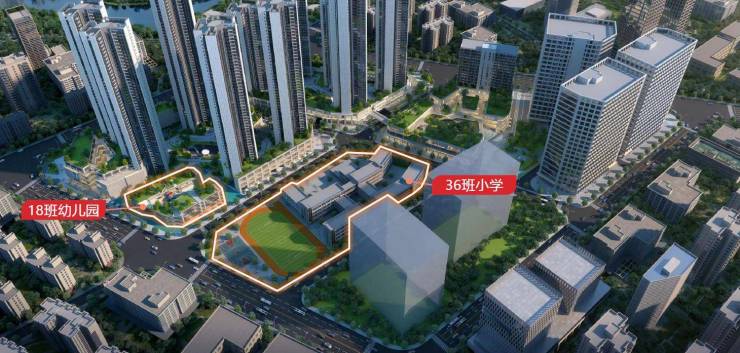 作为大城项目,项目地块内配建了一所18班幼儿园,临近贡献地块规划了一所36班公立小学。(注:实际学区划分以官方公告的为准,此仅展示规划学校与项目之间的地理关系)