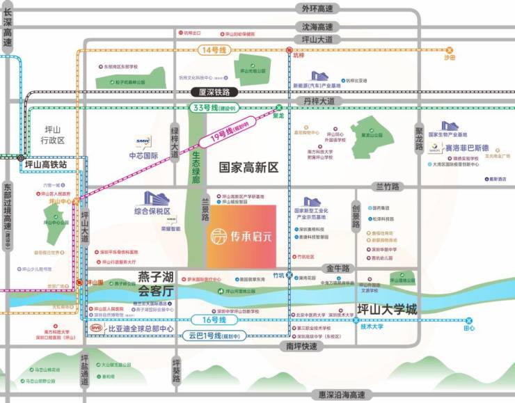 传承启元位于金牛东路和兰景中路交汇处,拥揽多元区位要素,在坪山高新区、燕子湖城市会客厅和坪山大学城的辐射范围内,恰好在它们形成的三角交汇中心。