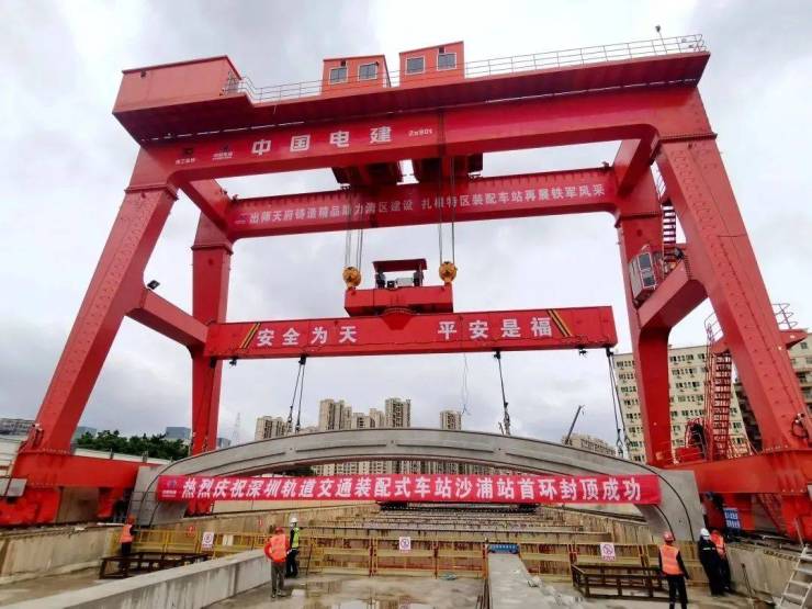 12号线二期沙浦站装配式车站首环顶板预制块吊装就位,标志着该装配式车站首环闭环成功完成!