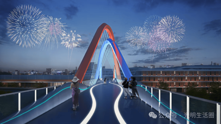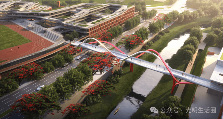 该连廊项目位于光明区凤凰街道,由光明区建筑工务署负责建设,新建与原校区连通天桥,桥长约116.19米,桥宽7米,采用系杆拱桥结构,在满足桥下净空与桥梁承重要求的同时,兼顾同观路通行需求与鹅颈水生态廊道的完整性。