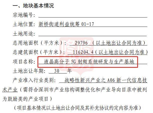 产业发展监管协议显示,该地将建液晶高分子 5G 射频系统研发与生产基地。