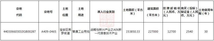 宗地号A409-0465,土地位置宝安区燕罗街道,土地用途普通工业用地,准入行业类别战略性新兴产业之A06新一代信息技术产业,土地面积153850.33平方米,建筑面积227000平方米,挂牌起始价12700万元,土地使用年限30年。
