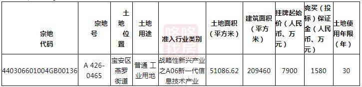 宗地号A426-0465,土地位置宝安区 燕罗 街道,土地用途普通 工业用地,准入行业类别战略性新兴产业之A06新一代信息技术产业,土地面积51086.62平方米,建筑面积209460平方米,挂牌起始价7900万元,土地使用年限30年。