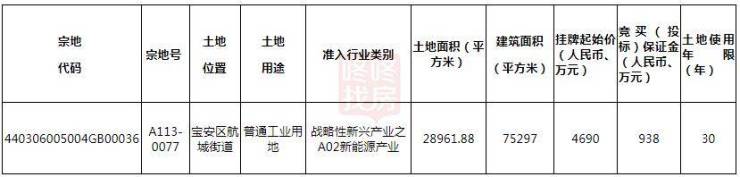 宗地号A113-0077,土地位置宝安区航城街道,土地用途普通工业用地,准入行业类别战略性新兴产业之A02新能源产业,土地面积28961.88平方米,建筑面积75297平方米,挂牌起始价4690万元,土地使用年限30年。