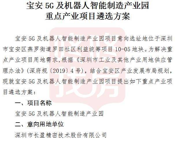 2022年6月,宝安区工业和信息化局发布《宝安5G及机器人智能制造产业园重点产业项目遴选方案》,意向用地单位为深圳市长盈精密技术股份有限公司。