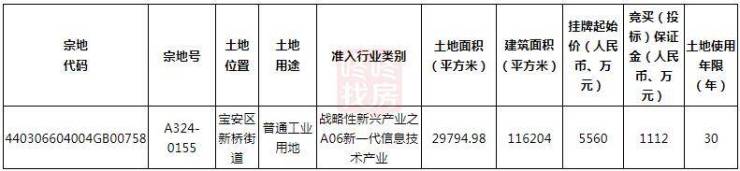 宗地号A324-0155,土地位置宝安区新桥街道,土地用途普通工业用地,准入行业类别战略性新兴产业之A06新一代信息技术产业,土地面积29794.98平方米,建筑面积116204平方米,挂牌起始价5560万元,土地使用年限30年。