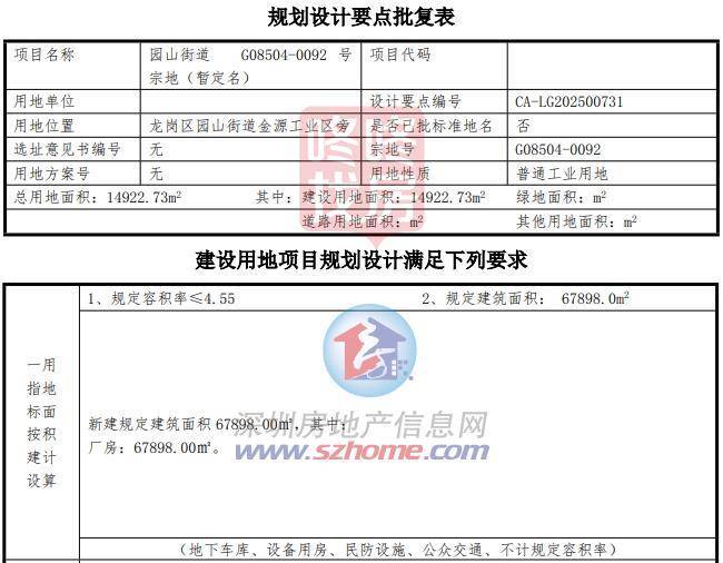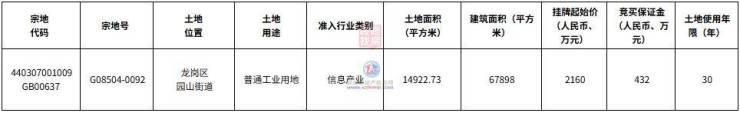 宗地号G08504-0092,土地位置龙岗区园山街道,土地用途普通工业用地,准入行业类别信息产业,土地面积14922.73 平方米,建筑面积67898平方米,挂牌起始价2160万元,土地使用年限30年。