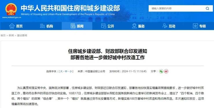 11月15日,住房城乡建设部、财政部联合印发通知,部署各地进一步做好城中村改造工作。