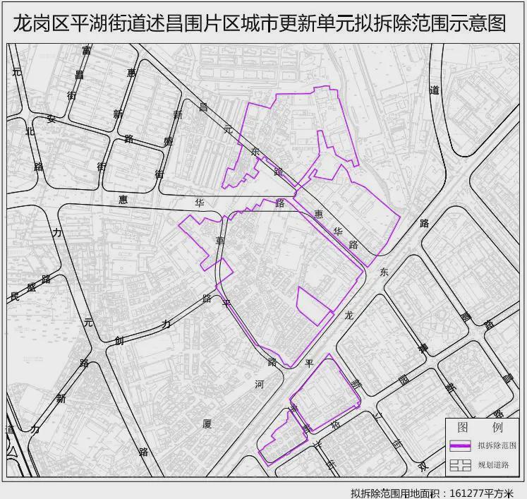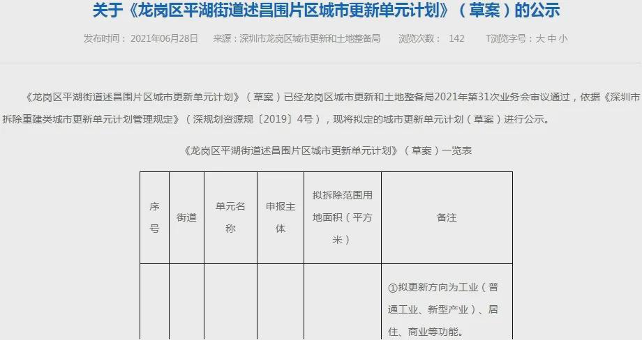 6月28日,龙岗区平湖街道述昌围片区城市更新单元计划(草案)公示,拟拆除范围用地面积约16.1万㎡。