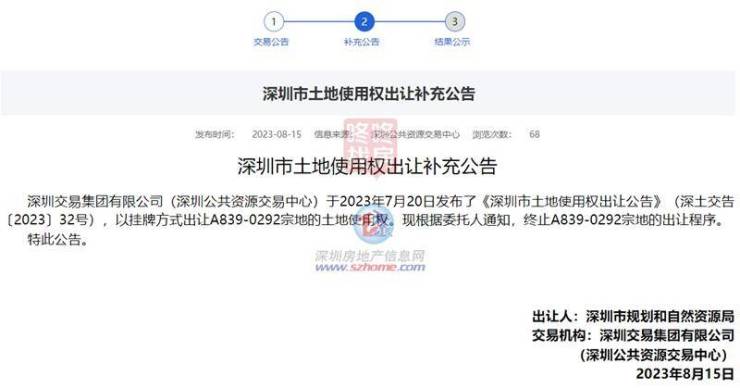 8月15日,交易中心发布公告,龙华A839-0292宗地终止交易。