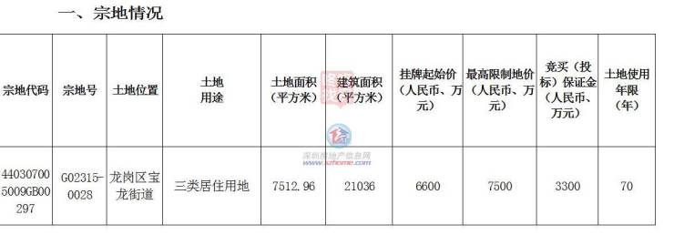 龙华大浪A839-0292:土地用途二类居住用地,土地面积33850.6平方米,建筑面积159430平方米,挂牌起始价25.79亿,最高限制地价29.65亿。建成后商品住房平均销售价格不高于57000元/平方米(不含室内装修价格)。(该地已经终止交易)