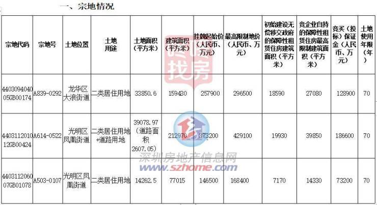 光明凤凰A503-0107:土地用途二类居住用地, 出让宗地总面积14262.5平方米,建面约77015平方米,挂牌起始价14.65亿,最高限制地价16.84亿;建成后普通商品住房平均销售价格不高于50300元/平方米(不含室内装修价格)。