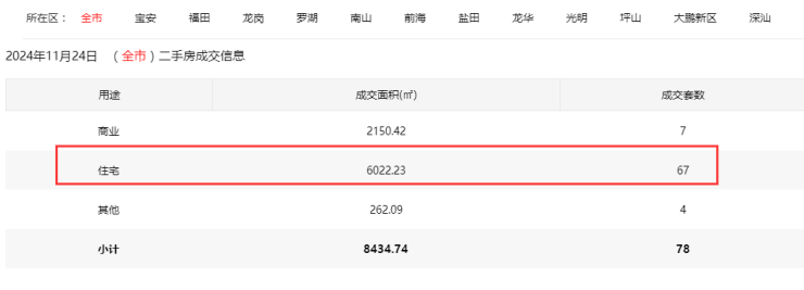 2024年11月24日二手房住宅网签67套。其中,宝安12套;福田8套;龙岗18套;罗湖9套;南山16套;盐田1套;龙华1套;坪山2套;光明3套;大鹏0套。