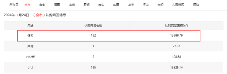 2024年11月24日新房住宅认购网签132套。其中,宝安44套;福田0套;龙岗24套;罗湖10套;南山2套;盐田1套;龙华29套;坪山2套;光明20套;大鹏0套;深汕0套。2024年11月24日新房购房合同…