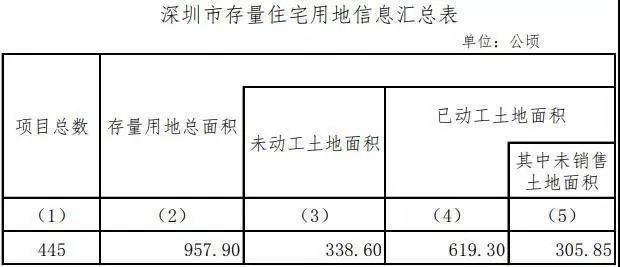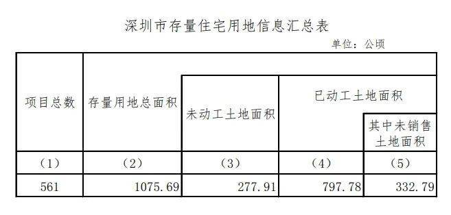 据清单显示,深圳存量住宅项目共613个,存量用地总面积1192.09公顷,未动工土地面积331.00公顷,已动工土地面积861.09公顷,已动工面积未销售土地面积353.45公顷。
