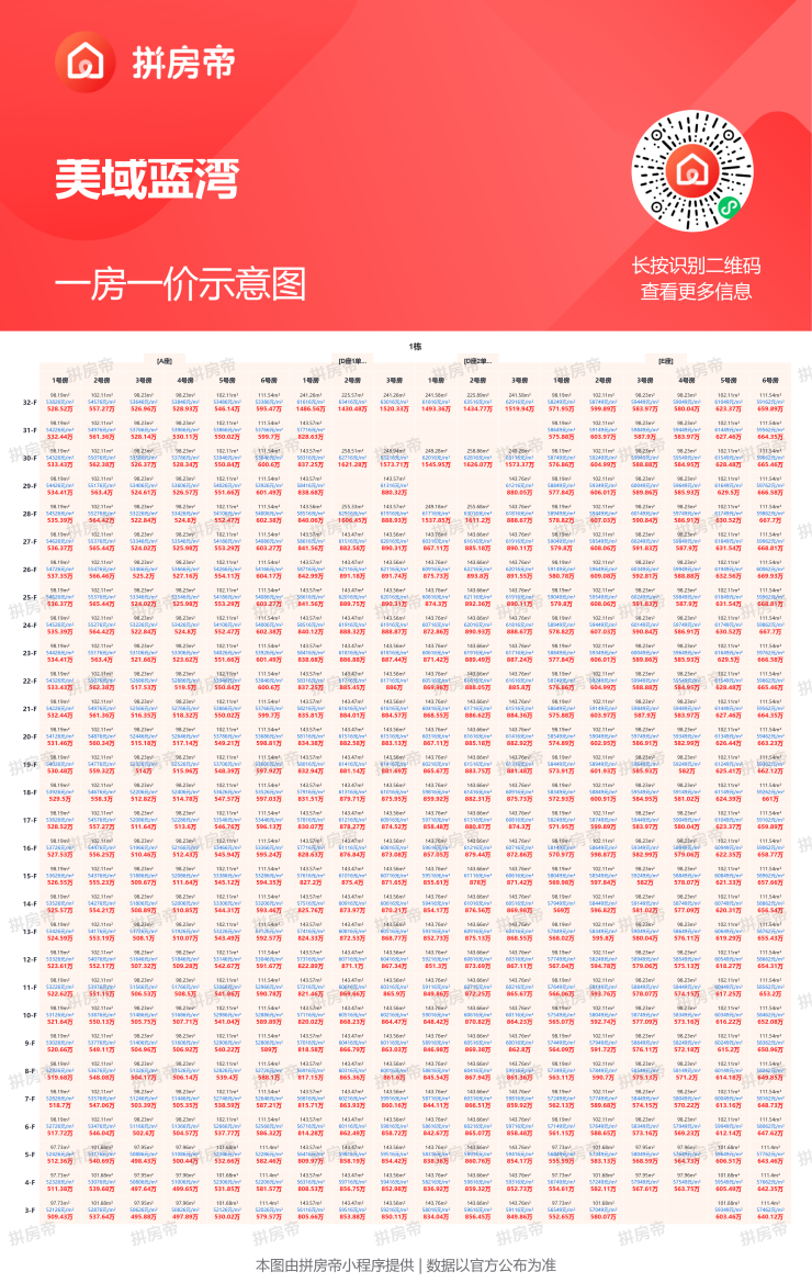 美域蓝湾花园占地面积约3.5万㎡,总建筑面积约17万㎡,容积率3.21,共由6栋30-31层高的住宅、7栋2层的商墅组成。据悉,项目1栋A/B/E座为3梯6户设计,1栋C座2梯4户,1栋D座2梯3户设计。