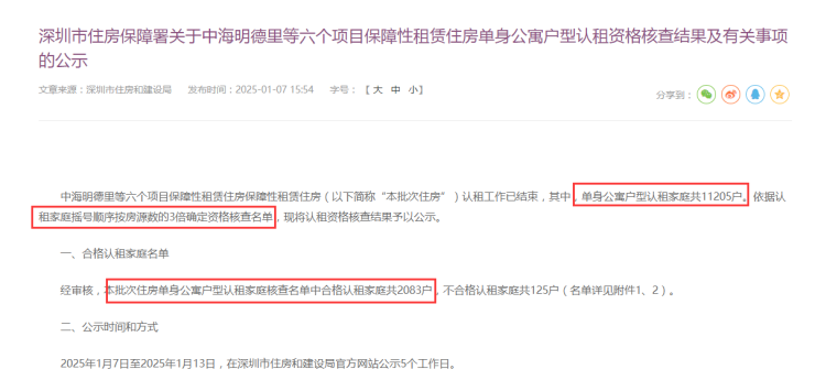 1月7日,深圳住建局发公告公示,单身公寓户型认租资格核查结果及有关事项。