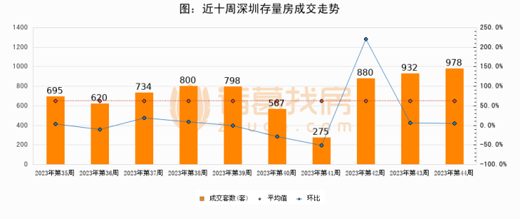 存量房方面,第44周深圳存量房成交978套,较上周增加46套,环比上涨4.9%。从近十周成交走势来看,周均成交套数为727套,本周高于平均水平34.5%。