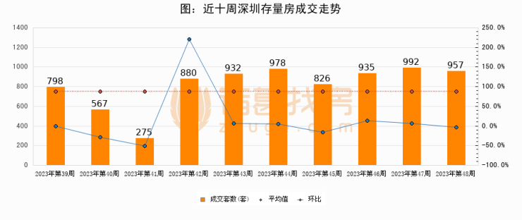 存量房方面,第48周深圳存量房成交957套,较上周减少35套,环比下降3.5%。从近十周成交走势来看,周均成交套数为814套,本周高于平均水平17.6%。