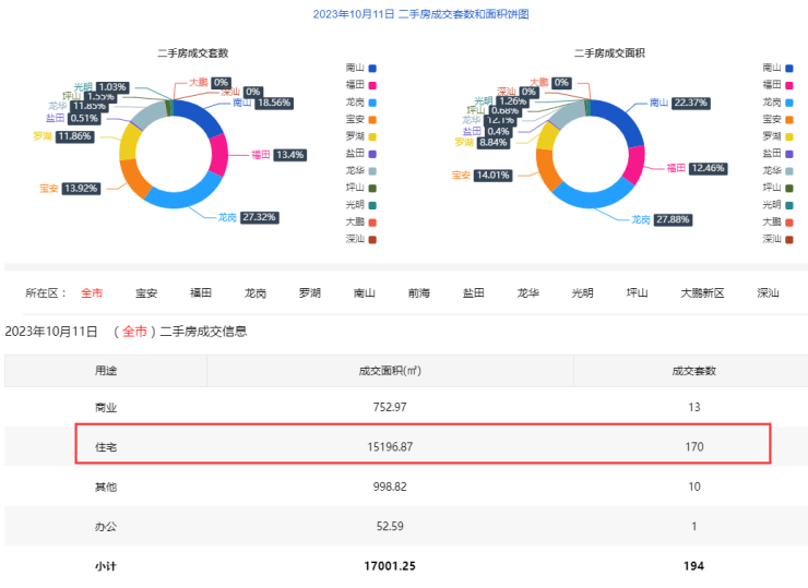 10月11日二手房住宅网签170套。宝安20套;福田24套;龙岗48套;罗湖22套;南山36套;盐田1套;龙华16套;光明2套;坪山1套;大鹏0套。
