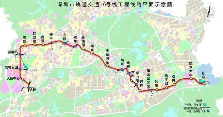 地铁16号线由大运站引出,沿龙岗大道、黄阁路、龙平路敷设,终至田心站。