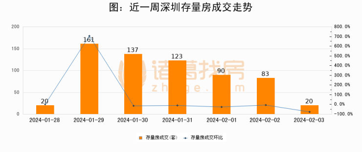 从存量房来看,2024年02月03日深圳存量房单日成交20套,比昨日减少63套,环比下降75.9%。从近一周存量房成交来看,深圳存量房日均成交套数为90套,02月03日单日成交20套,低于近一周平均水平77.8%。