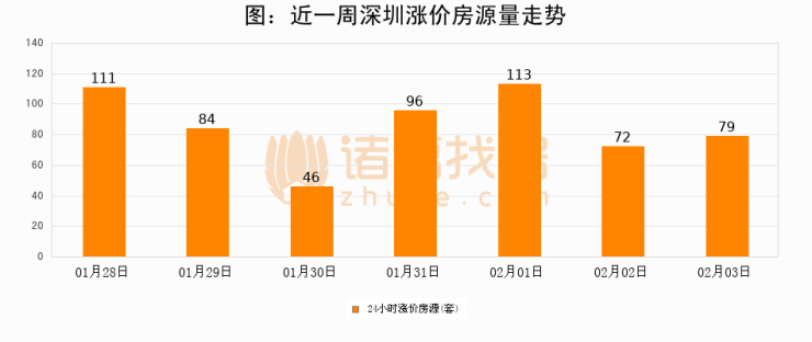 根据诸葛找房数据显示,深圳24小时涨价房源量为79套,较02月02日增加7套,环比上涨9.7%。与此同时,涨价房源占比小幅扩大,业主信心有所提升。