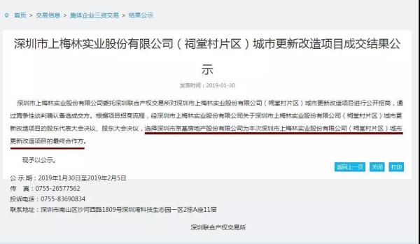 2019年1月30日,据深圳联合产权交易所公示显示,经深圳市上梅林实业股份有限公司关于深圳市上梅林实业股份有限公司(祠堂村片区)城市更新改造项目的股东代表大会决议、股东大会决议,选择深圳市京基房地产股份有限公司为本次深圳市上梅林实业股份有限公司(祠堂村片区)城市更新改造项目的最终合作方。