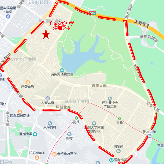 6广东实验中学深圳学校(新建)地址:坂田街道象塘路与风门路交汇处招生范围:五和大道——环城北路——坂澜大道——沈海高速围合区域,小学、初中保持一致。该学区与深大附属坂田学校、宝岗小学共享。