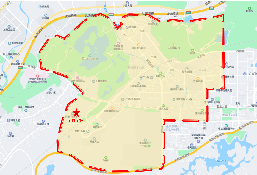 小学部招生范围:宝龙社区比宝二路以西、宝荷路——积谷田路——南约河(水二支流)——沙荷路围合区域。该学区为共享学区,片区内适龄儿童仍可继续申请原有学校。