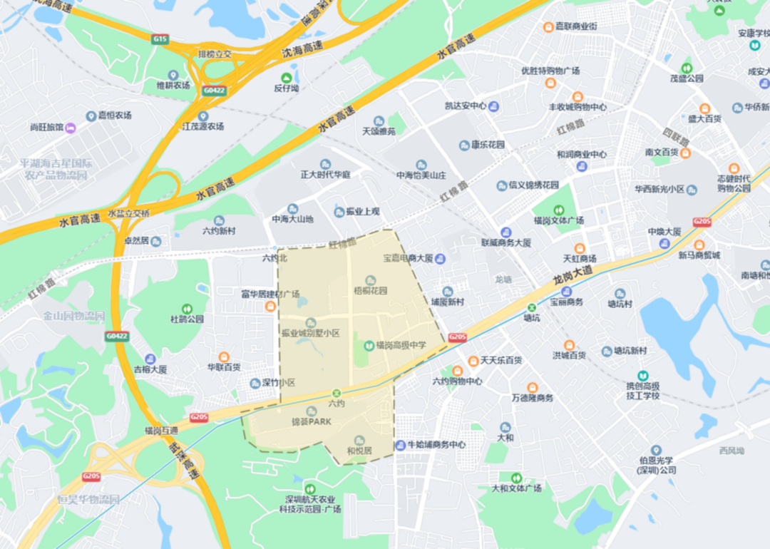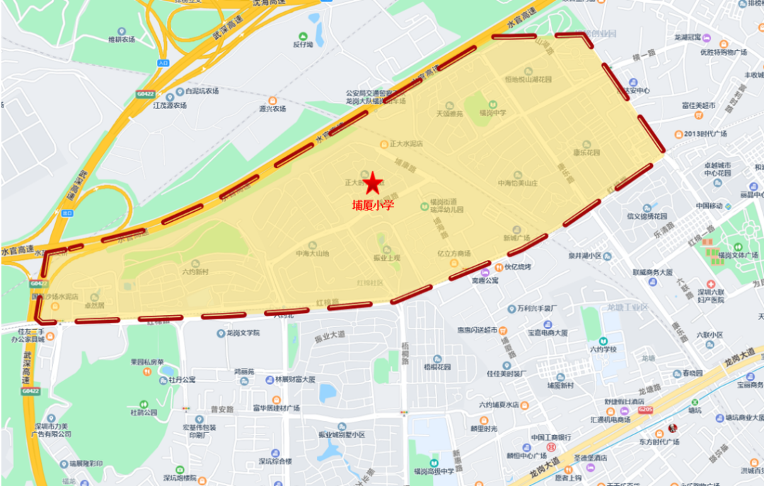 同时,将深峰路——红棉路——埔厦路——龙岗大道——牛始埔路——金塘路的围合区域加入梧桐学校与六约学校小学和初中的共享片区,两校其余招生地段不变。