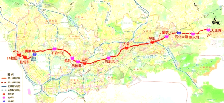 深大城际起于深圳机场,终点位于惠州大亚湾,全线共设14站,其中深圳段包含11站。深大城际的建设将分为两段进行,首先启动的是深圳段的工程,即从深圳机场至坪山段的线路建设;随后将展开惠州段,也就是大亚湾段的线路建设。