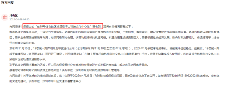 关于“19号线增设坪山科技文化中心站”,深圳市坪山区交通轨道管理中心回复称:目前19号线一期已经在建,线站位已稳定。19号线聚龙站(在建)距离坪山坑梓科技文化中心直线距离约1千米,待聚龙站建成投入使用后,将有效提升坑梓科技文化中心所在片区的轨道交通服务水平。