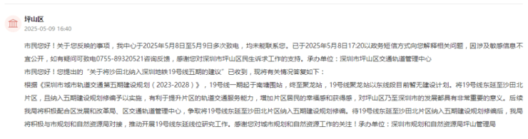 关于“19号线南延至盐田”,有关部门则是通过电话联系的方式回复了网友。