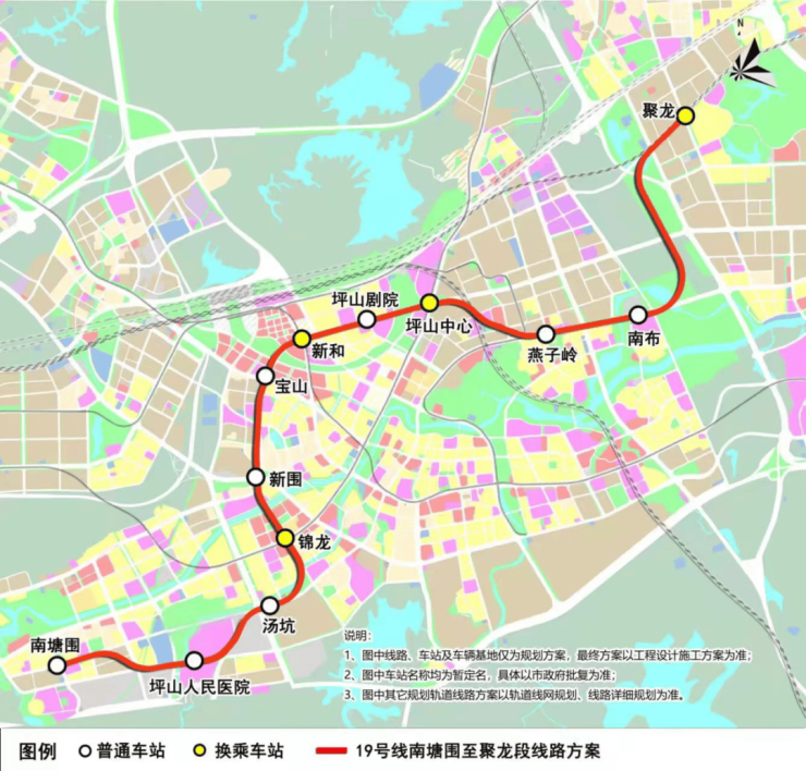 19号线一期线路,贯穿坪山南北,南起南塘围站、北抵聚拢站,共设12座车站。二期预计延伸至横岗等区域,具体路线待定。