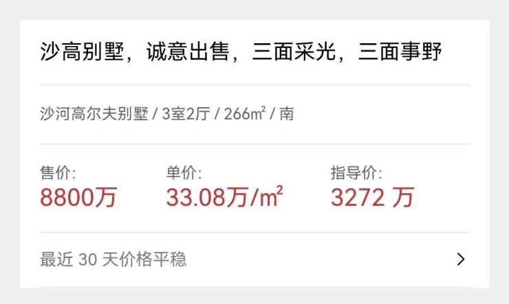 1.6亿成交的沙河高尔夫别墅,目前小区内一套266㎡的别墅,业主报价8800万,单价约33万/㎡,单价远低于法拍房的37.73万/㎡。