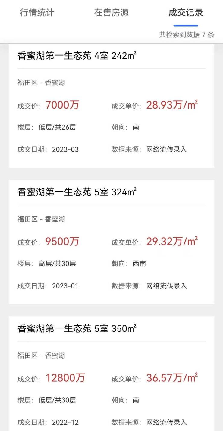 又如香蜜湖第一生态苑(香蜜湖一号),小区成交价曾一度冲到36万/㎡,目前有所回落,最近一套成交的房源在去年,价格在29万/㎡,而法拍房的价格是20.03万/㎡,中间也有近10万/㎡的价差。