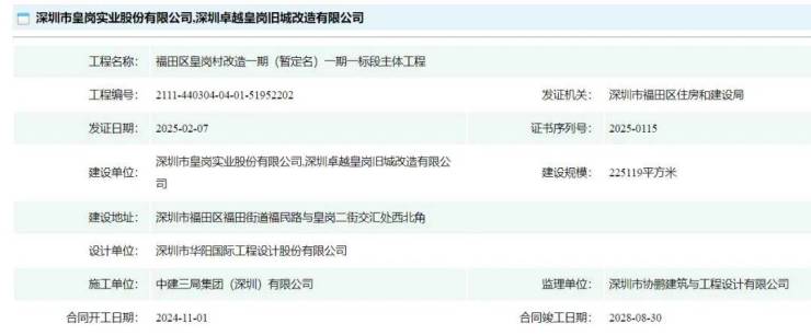 2月7日,深圳市住建局发放了关于福田区皇岗村改造一标段主体工程的施工许可。