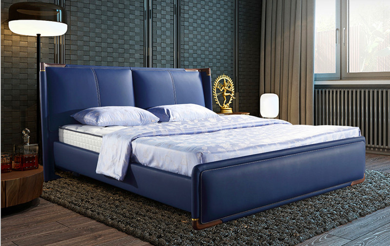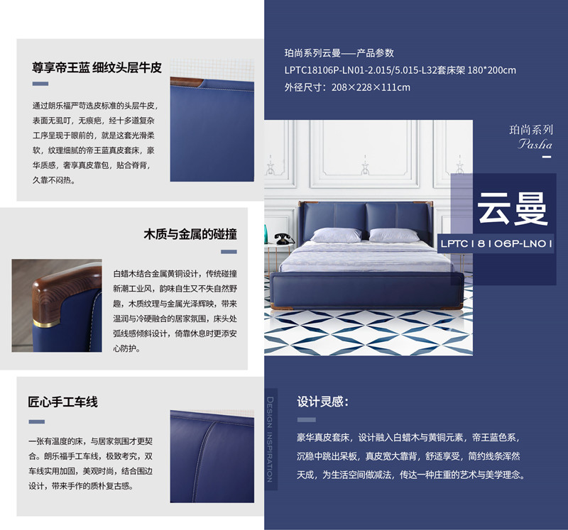 朗乐福严苛选皮标准,呈现给您的成品便无一不精致,光滑柔软、皮感细腻的帝王蓝头层牛皮,无虱叮无痕疤,豪华质感,皇室蓝色系,经典简约设计,点缀白蜡木金属黄铜元素,韵味自生又不失自然野趣,床头处弧线感倾斜设计,倚靠休息时更添安心防护。