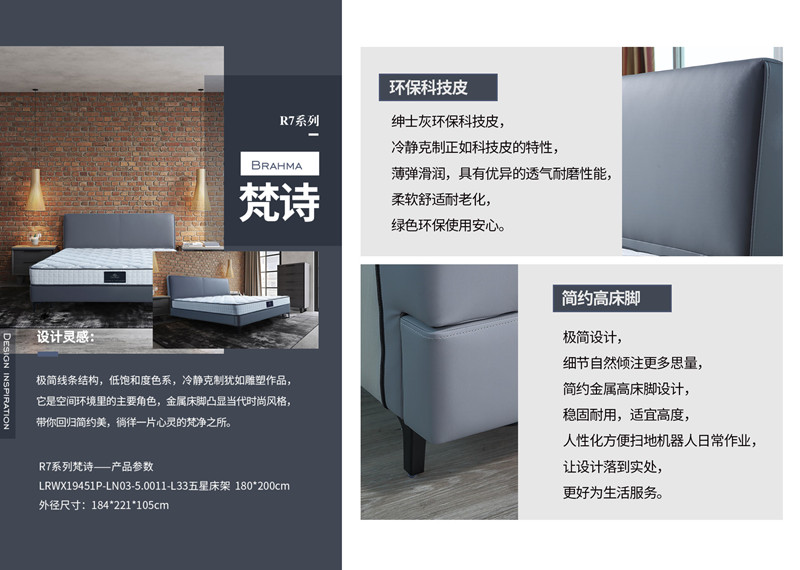 绅士灰环保科技皮,温和安宁的气质,只静静伫立,就已拥有抚慰人心的魔力。触感薄弹滑润,具有优异的透气耐磨性能,柔软舒适耐老化,简约金属高床脚,稳固耐用,高度设计更显人性化,方便扫地机器人日常清洁,简单利落的造型,可轻松融入当代风格的空间。
